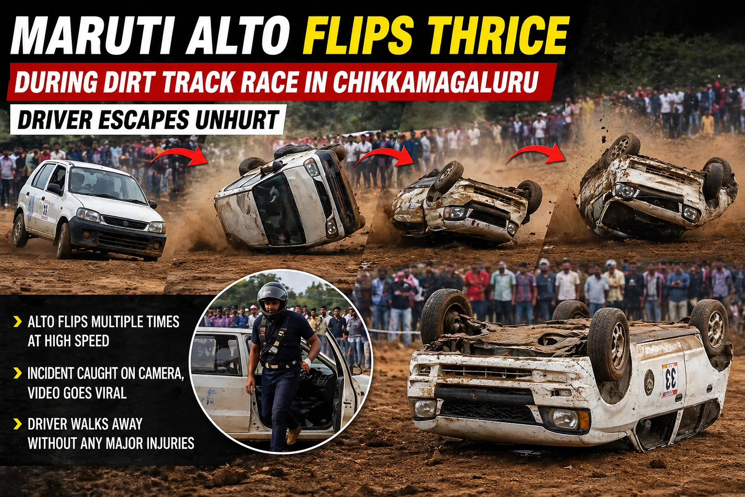 A dramatic incident from Karnataka’s Chikkamagaluru district has gone viral after a small hatchback was seen flipping multiple times during a dirt track race. The car, identified as a Maruti Suzuki Alto, lost control at high speed before tumbling across the uneven track.