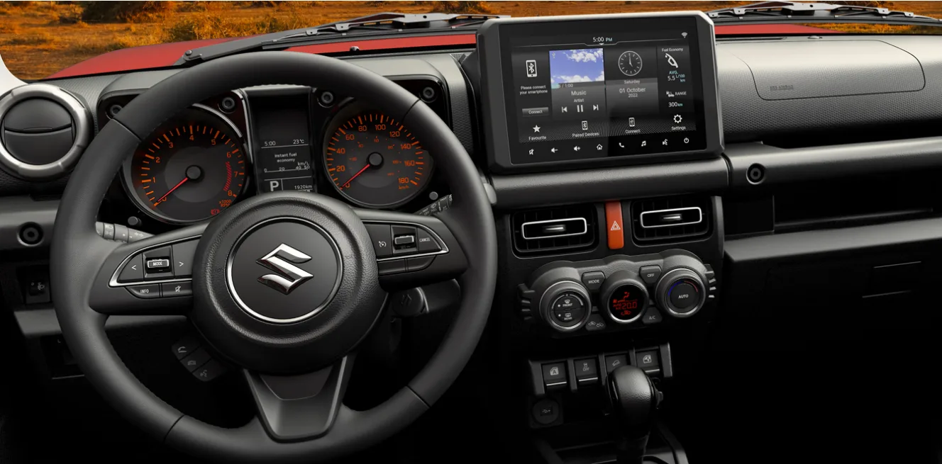 Inside, it offers a 9-inch touchscreen infotainment system with smartphone connectivity, automatic climate control, and power windows. The SUV uses Suzuki’s AllGrip Pro 4WD system with low-range gearing for serious off-roading.