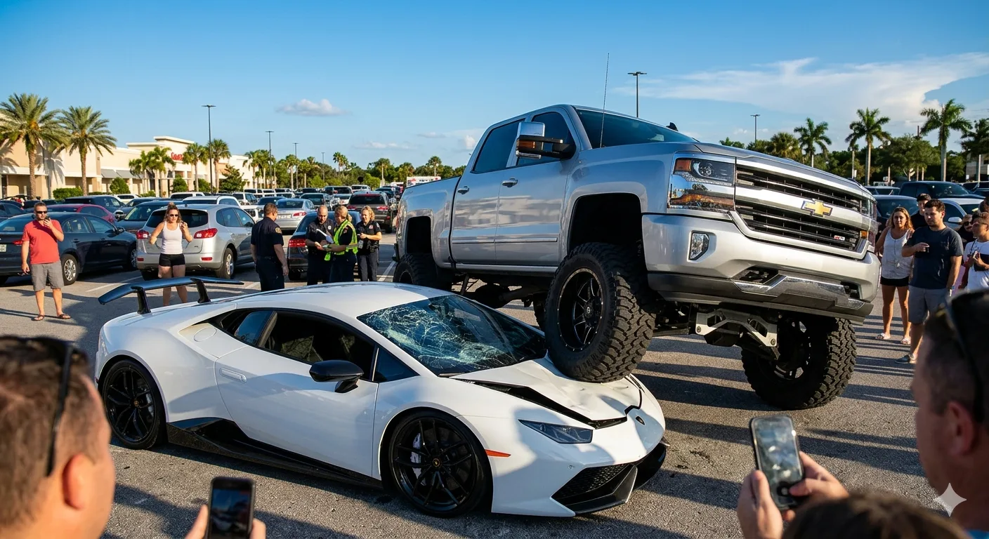 The incident, which took place in a crowded Florida parking lot, features a stark contrast in automotive engineering: a low-slung, high-performance Italian masterpiece versus a towering, heavily modified American workhorse.